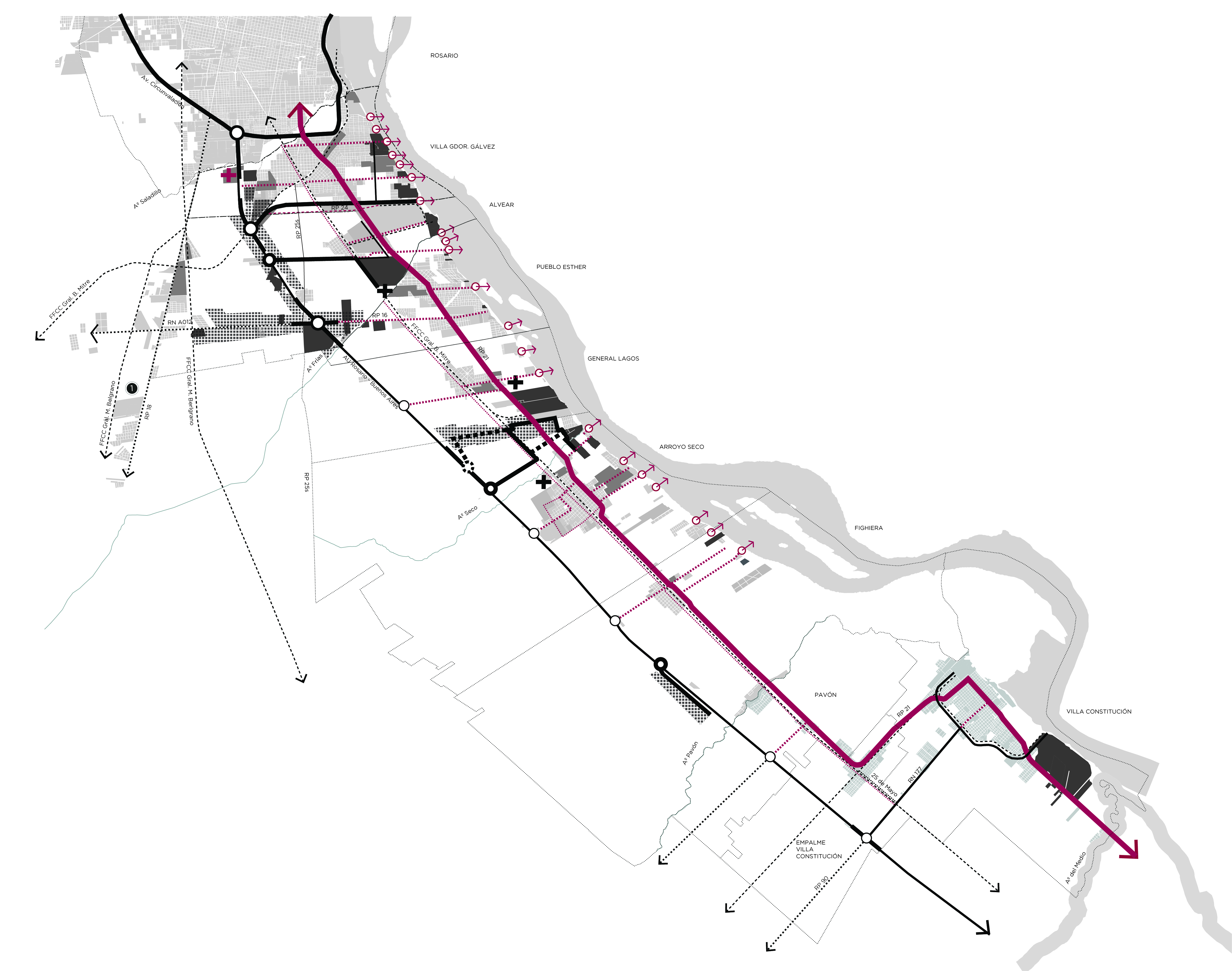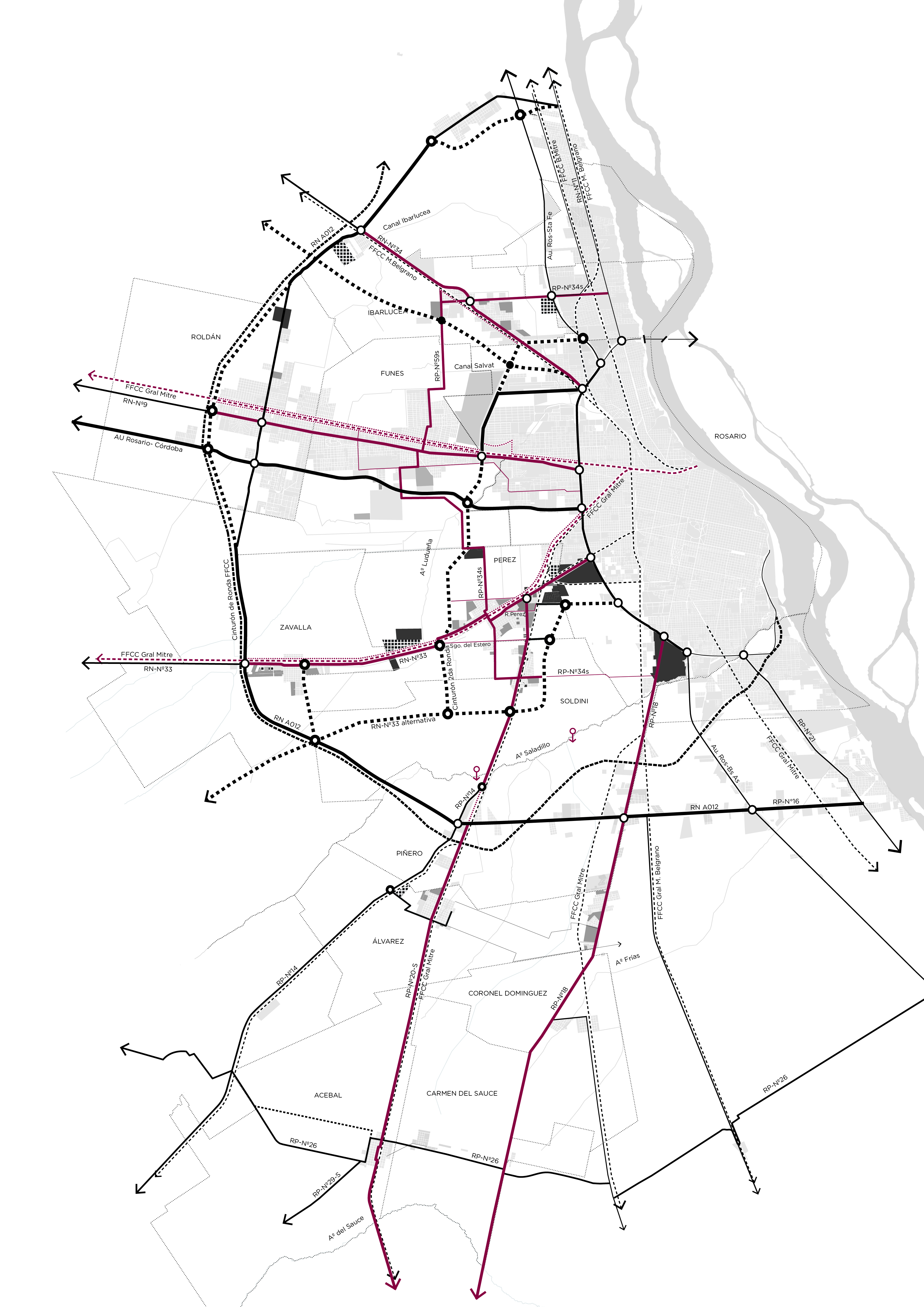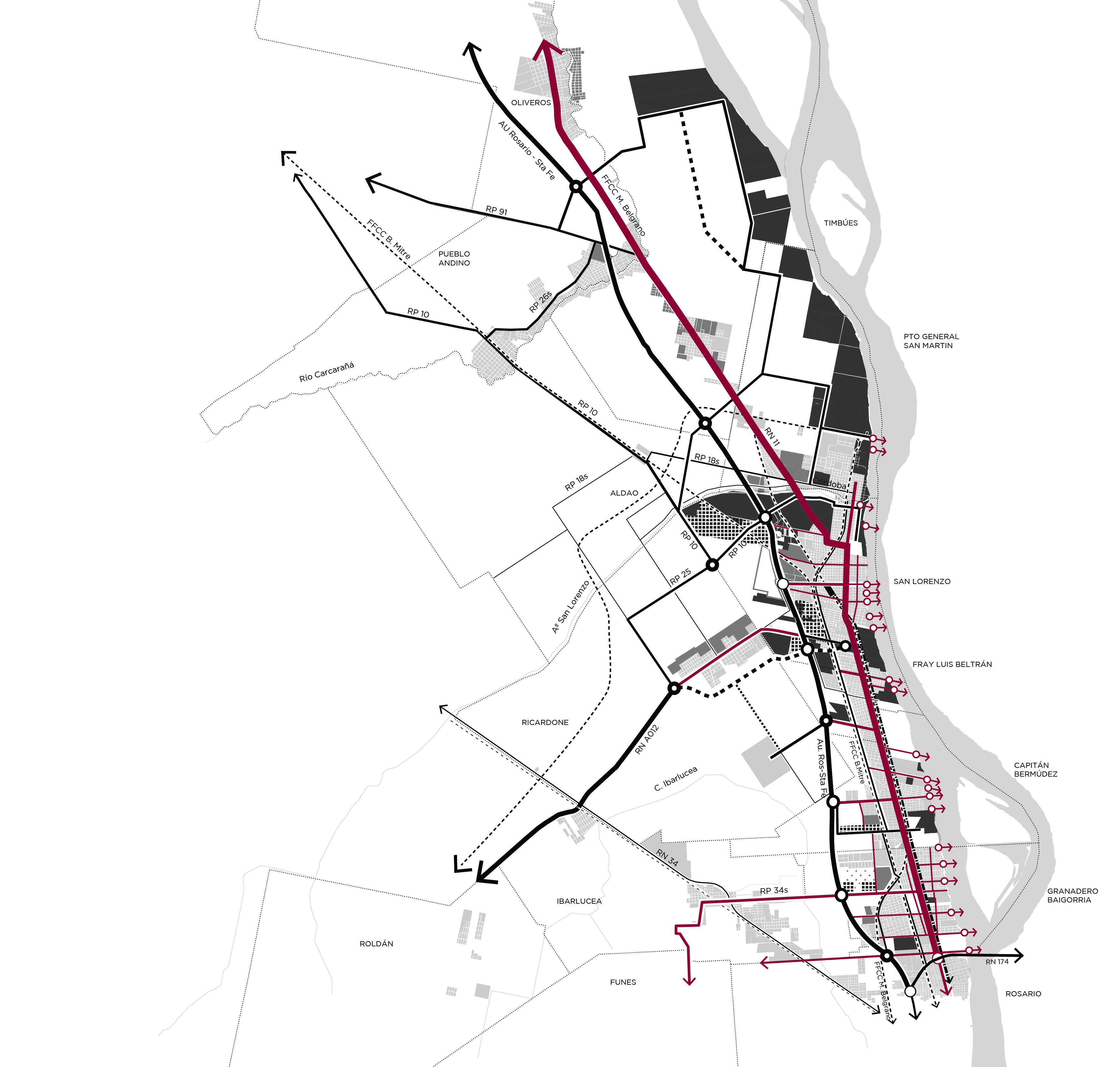 El origen de la estructuración territorial de la región fundada en la combinación de puerto y líneas ferroviarias, condicionó el desarrollo urbanístico posterior. Rosario se consolidó y expandió con tal rapidez en el s. XIX, que dibujó un contundente trazado aún hoy legible en el territorio: líneas ferroviarias trazadas hacia norte y sur (complementadas por trazas viales en el s. XX) que acompañan el límite ribereño, más un abanico tentacular diseminado al oeste.