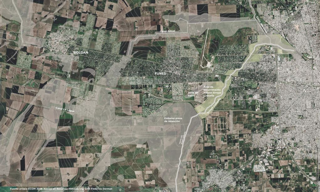 El arroyo Ludueña -cuerpo de agua relevante en el área metropolitana de Rosario- ejerce una fuerte influencia en la dinámica del sector y recibe aportes importantes de la cuenca alta del mismo. Esta actividad ha causado históricamente numerosas inundaciones, tanto en la localidad de Funes, como hacia aguas abajo, en los barrios periféricos de Rosario. Para controlar las crecidas del arroyo Ludueña, en la década del ´90 se diseñó y ejecutó una presa de tierra en el valle de inundación del mismo. Como resultado se ha logrado atenuar el pico de las crecidas, evitando de esta manera los anegamientos periódicos de importantes zonas de ambas localidades. Esto significa que el arroyo ya no se desborda para eventos de esta magnitud (recurrencia entre 25 y 50 años). Sin embargo, entre la Autopista Rosario- Córdoba y la Avenida Illia (continuación de calle Mendoza), existe una zona naturalmente baja que concentra aportes de un sector amplio recientemente urbanizado y sirve como cuerpo receptor de los mismos.