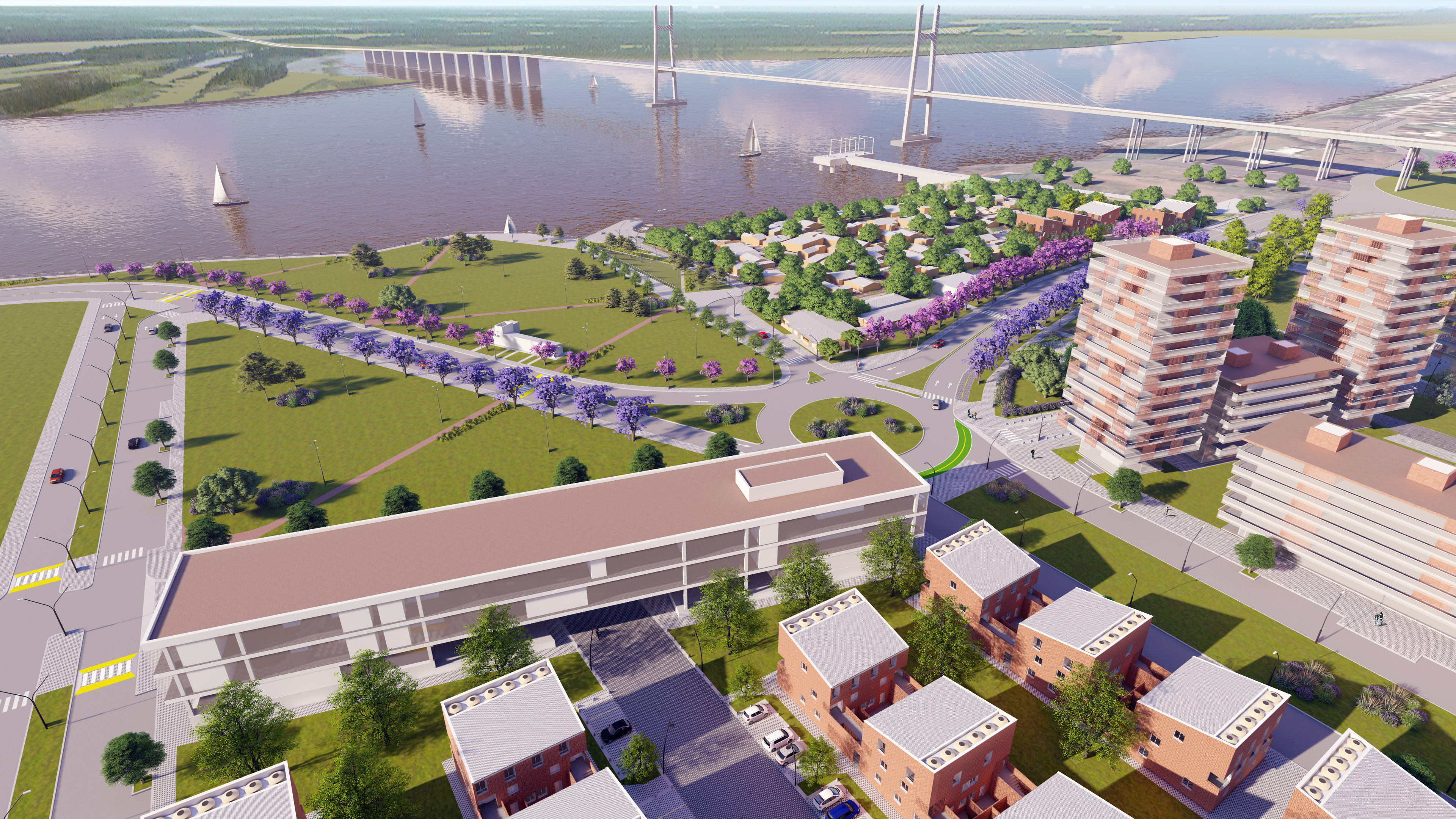 Las áreas residenciales se articularon con el desarrollo de un parque público deportivo recreativo que se construyó debajo de la estructura del puente reorganizando el tránsito a través de la modificación de los trazados vehiculares existentes.